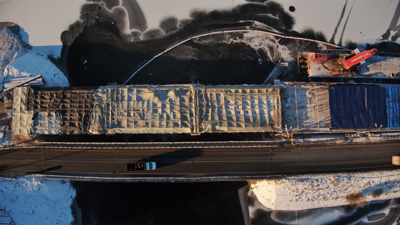 На текущий момент завершены самые сложные этапы работ: выполнено устройство фундаментов из буронабивных свай в русле реки, возведены промежуточные и крайние опоры моста. При этом сборка металлоконструкций пролетного строения проводилась на стапеле, а его установка в проектное положение выполнялась методом продольной надвижки к крайней опоре. Всего у нового мостового перехода четыре бетонные опоры, которые будут удерживать металлическую конструкцию весом 750 тонн. Кроме того, идут работы по устройству монолитной железобетонной плиты проезжей части моста, которая будет двухполосной. С обеих сторон проезжей части устроят дополнительные полосы безопасности и тротуары шириной 1,5 м.