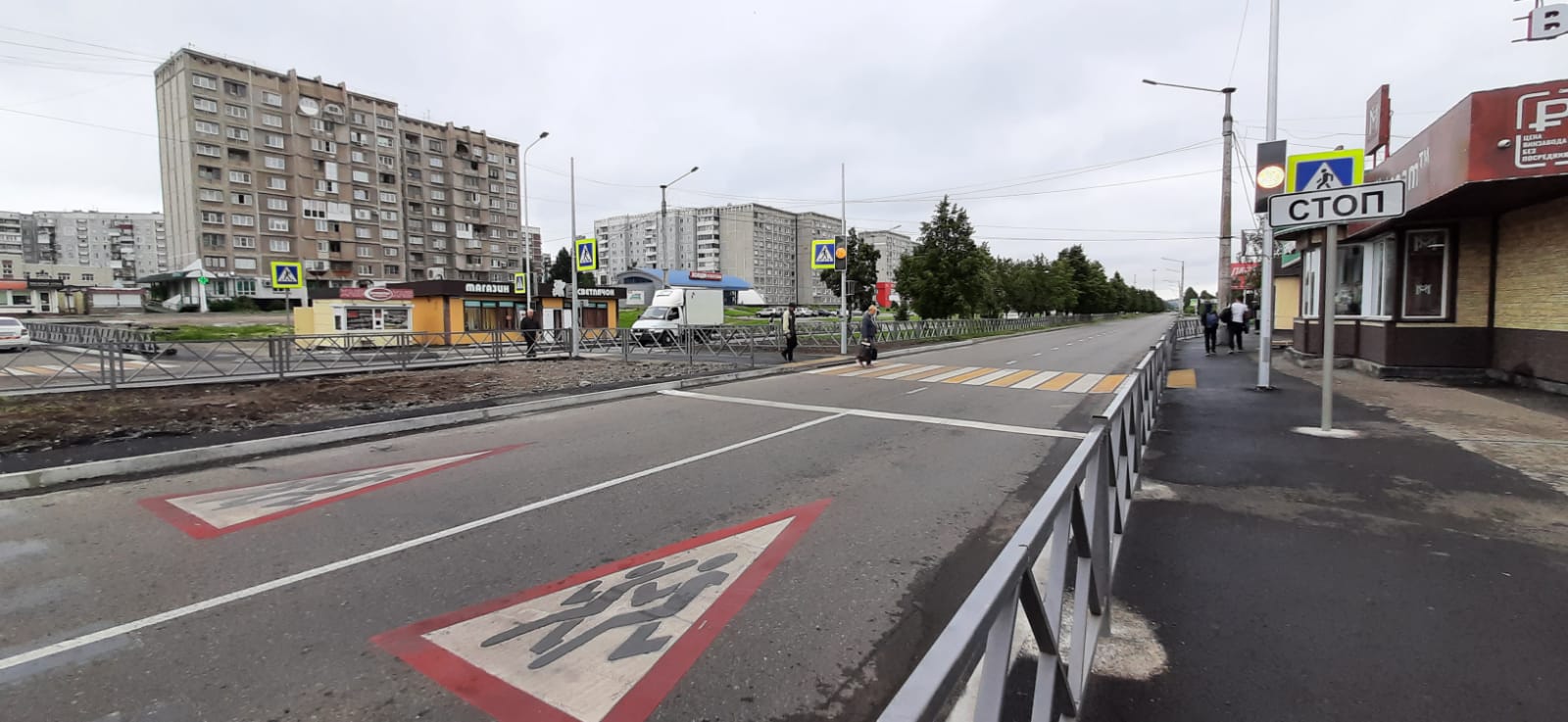 В рамках реализации нацпроекта помимо кроме светофоров, специалистами подрядной организации было установлено ограждение, нанесена разметка холодным пластиком, уложена тактильная плитка на подходах к пешеходному переходу для маломобильных групп населения.