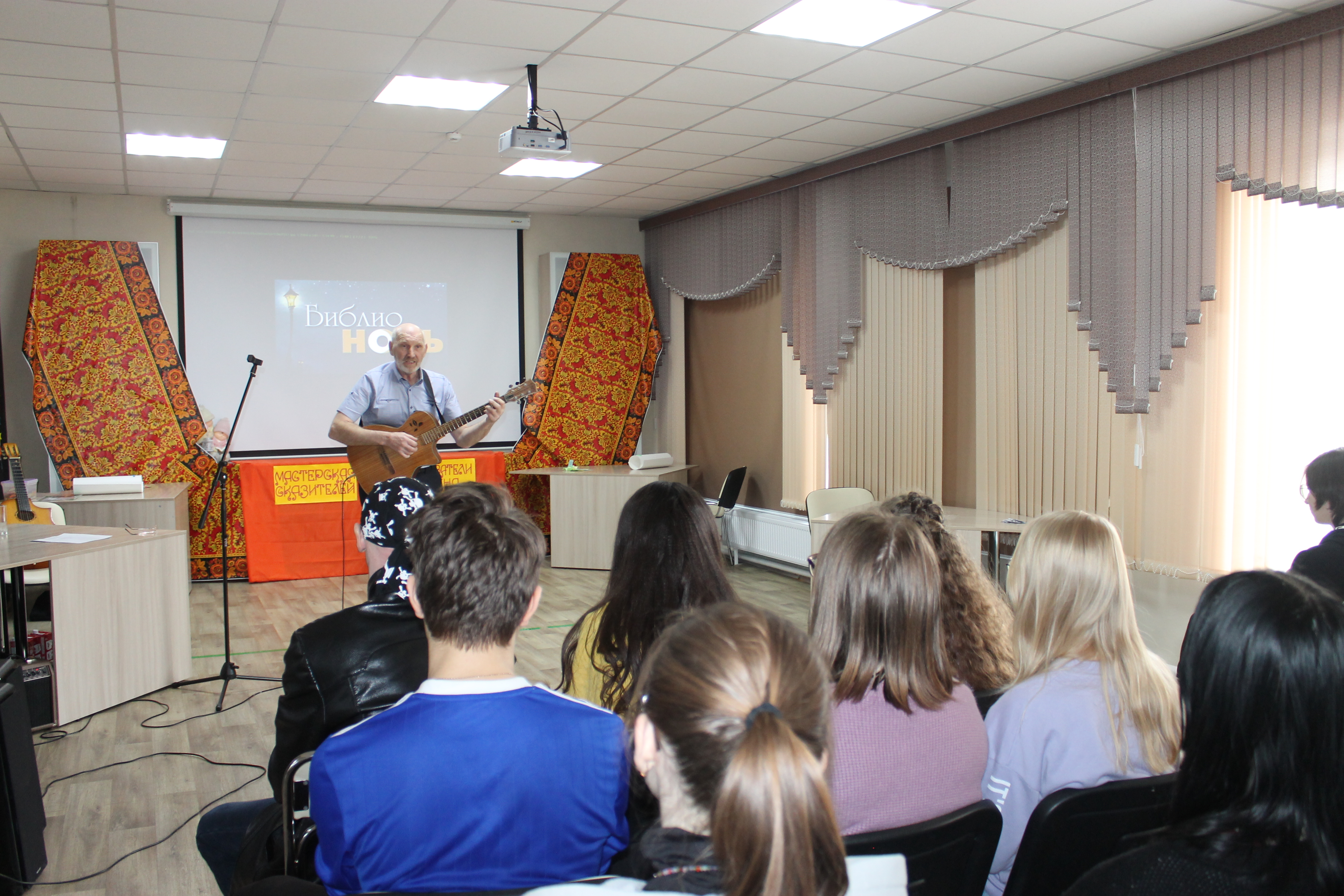 В читальном зале праздничную программу открыл Дмитрий Городнов с песней «Луч солнца золотого», а продолжили музыкальные и поэтические номера член творческого любительского объединения «Литературный салон» Кукин Д. П. и бас-гитарист группы СМИНА © Александр Кузнецов.