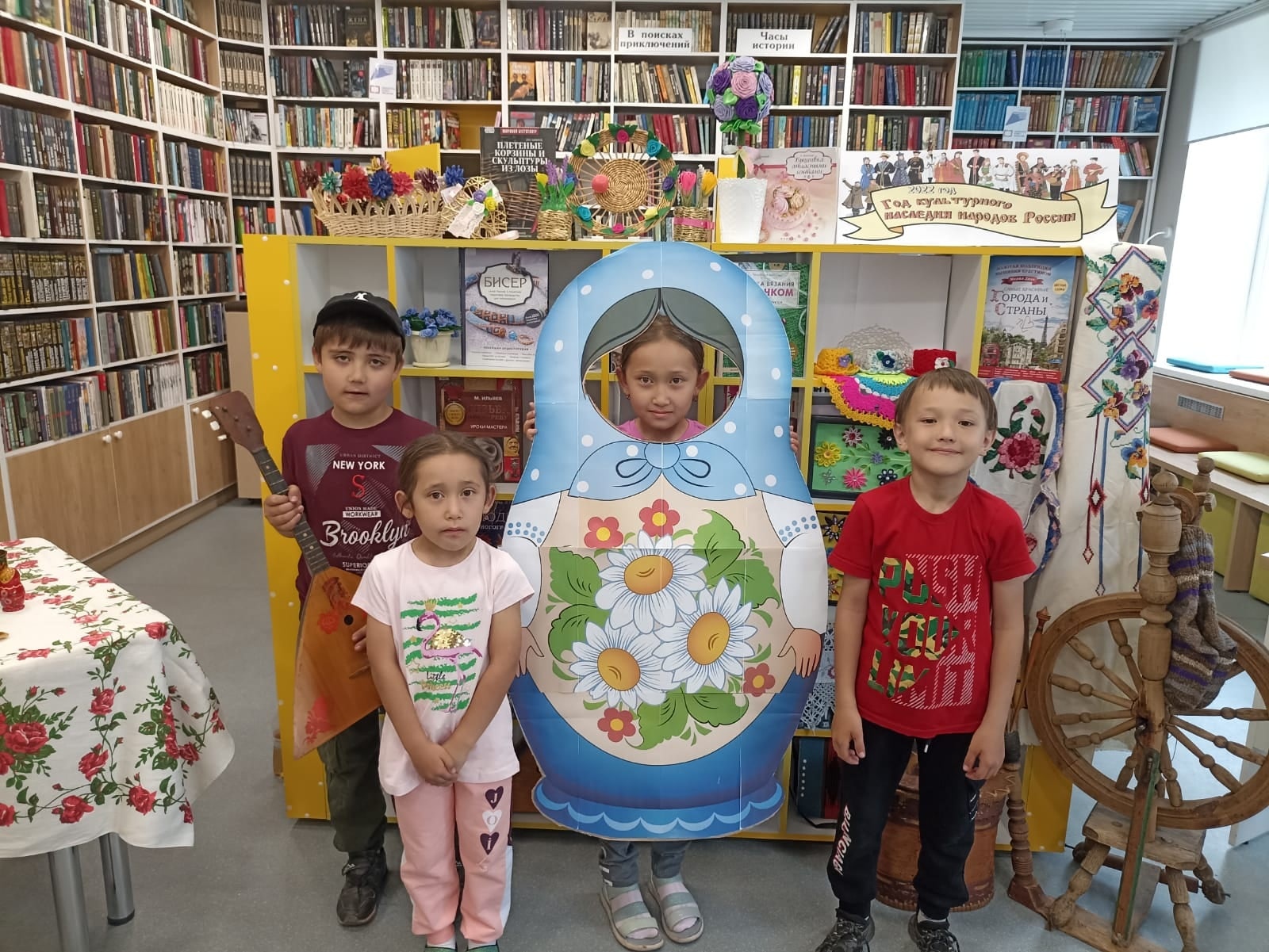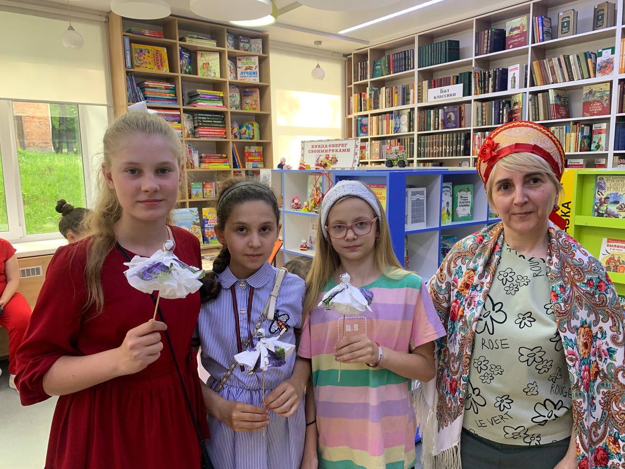 Большим успехом пользовалась фотозона «Русская матрёшка» и выставка «Народные промыслы России», где были представлены книги и рукотворные изделия читателей библиотеки в разных техниках (квилинг, бисероплетение, вязание, макроме и т.д.), а также игрушки амигуруми, сувениры из бересты. Экспозицию дополнили предметы народного быта из личных коллекций: матрешки, самовар, балалайка, пряха и многое другое. Любители декоративно-прикладного творчества приняли участие в мастер–классе по изготовлению домашнего оберега - куклы мотанка, которая способна защитить человека и его близких от сглаза, злых духов, а также сберечь домашний уют и покой.