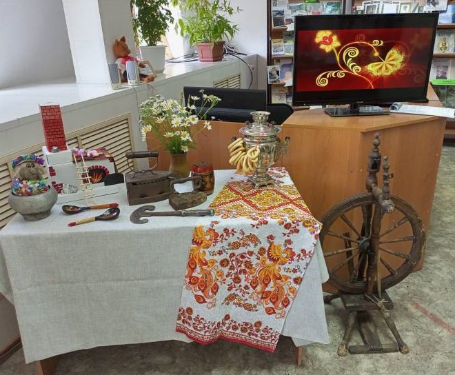 Прекрасным дополнением события стала книжно-иллюстративная выставка «Мир народной культуры», где книги и периодические издания были дополнены предметами быта: вышитыми полотенцами, расписными ложками, самоваром и угольным утюгом.