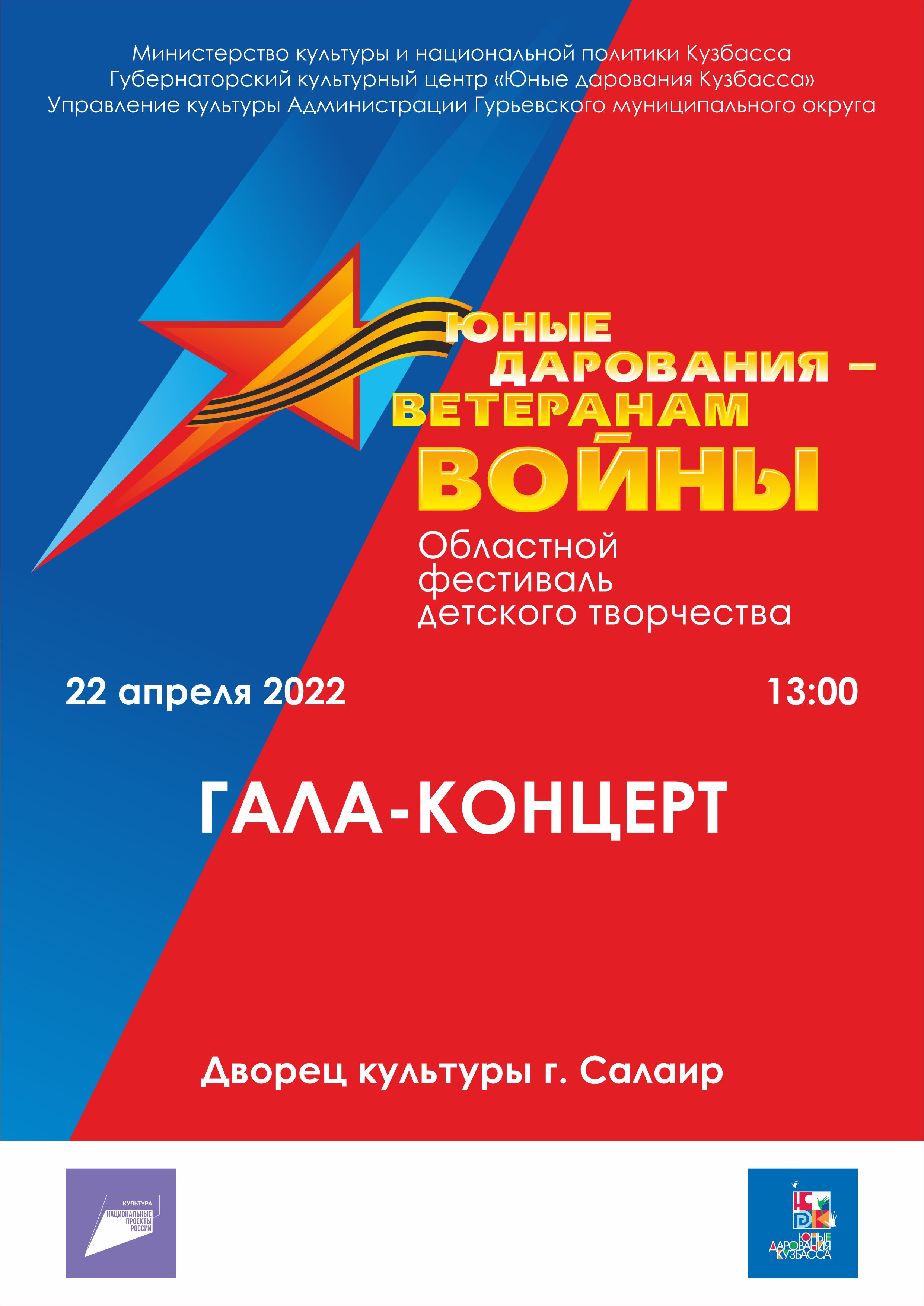 20-22 апреля 2022 года в Гурьевском муниципальном округе состоится Областной фестиваль детского творчества «Юные дарования – ветеранам войны». Фестиваль проходит под эгидой национального проекта «Культура» и входит в состав пяти областных фестивалей, реализуемых Губернаторским культурным центром «Юные дарования Кузбасса».