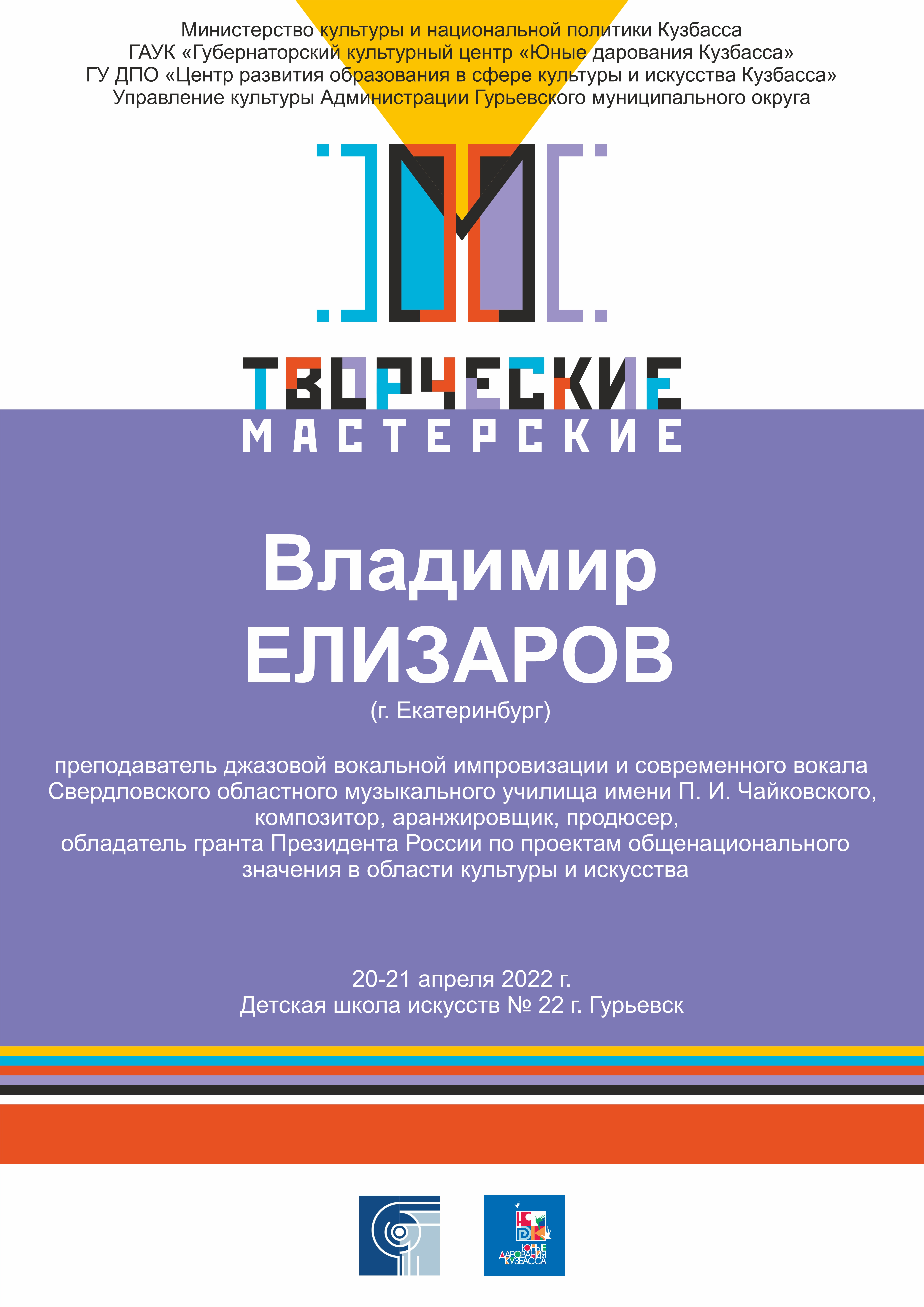 20-21 апреля в детской школе искусств № 22 г. Гурьевск пройдут мастер-классы Владимира Петровича Елизарова со стипендиатами губернаторской стипендии «Юные дарования Кузбасса» по специальности «Эстрадное пение». Юные вокалисты будут работать на репертуаре военных песен.