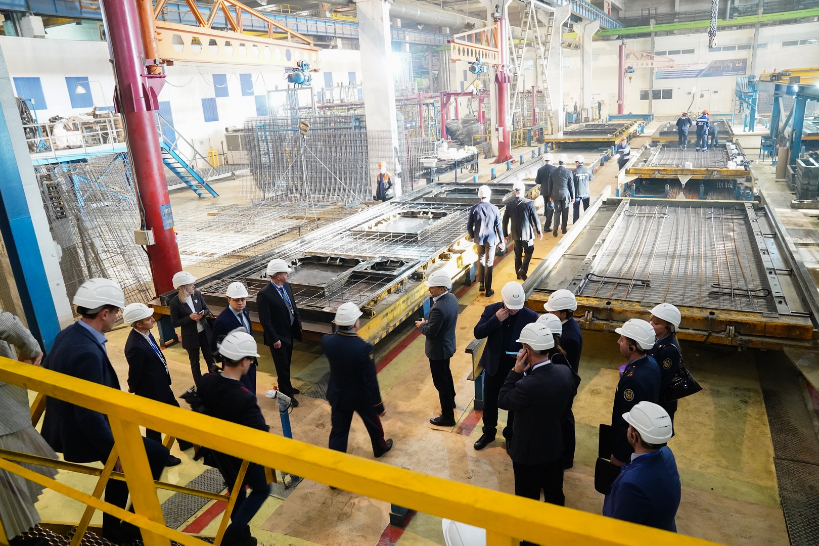 Делегация посетила производственную площадку — осмотрела оборудование и процесс производства свай, на арматурном участке оценила возможности по изготовлению требуемых размеров изделий из металлопроката, на участке крупнопанельного домостроения — изготовление изделий на паллетном производстве.