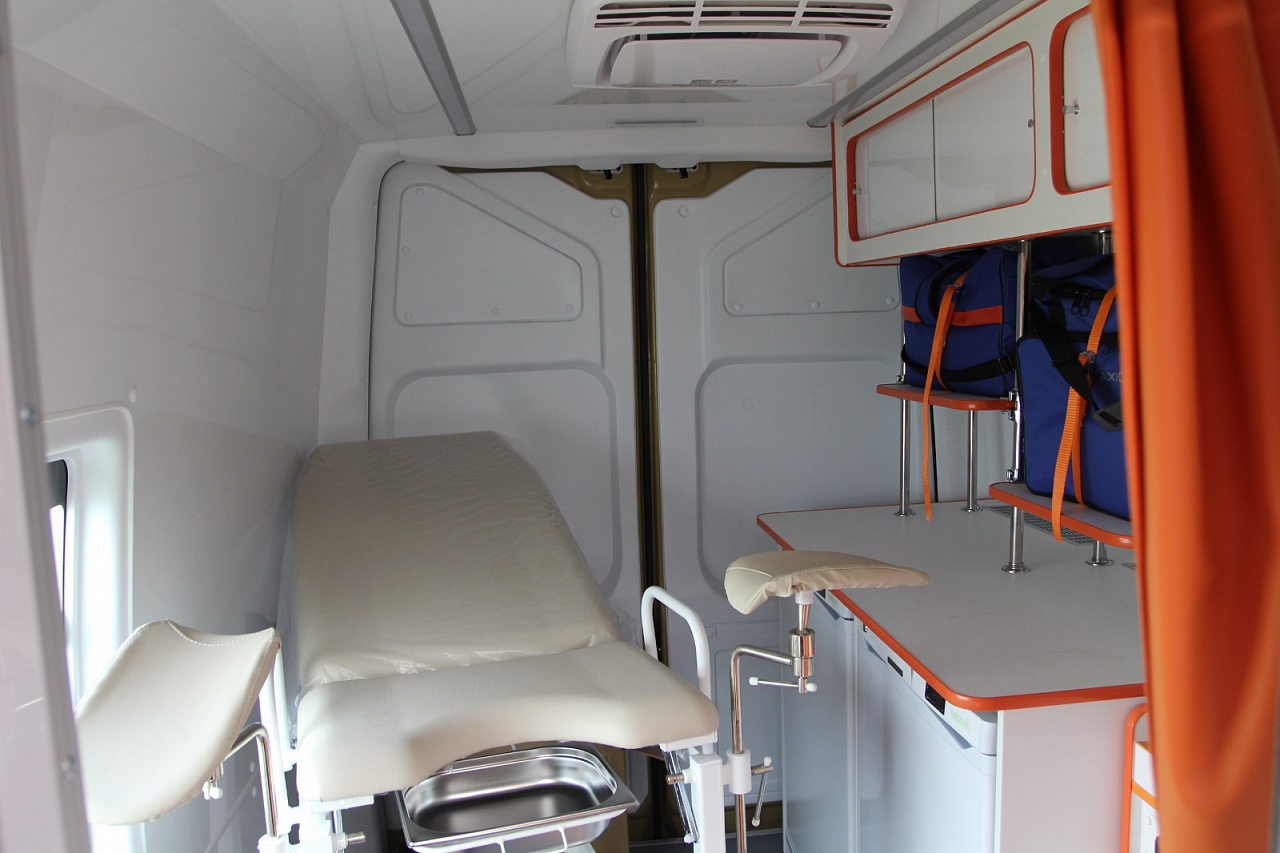 Внутри мобильного ФАПа имеется два кабинета – для терапевта и для гинекологического осмотра. Есть все необходимое оборудование для первичного приема пациентов – ростомер, взрослые и детские весы, кардиограф, тонометр, спиротест для функционального обследования легких, пульсоксиметр для измерения уровня кислорода в крови. Есть возможность взять кровь у пациента для анализа и сразу определить уровень сахара, холестерина и гемоглобина в крови, а также измерить внутриглазное давление.