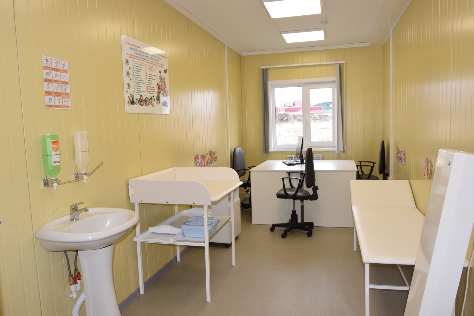 Новый медпункт полностью благоустроен. Проведена централизованная система водоснабжения, есть отопление, канализация, вентиляция и система кондиционирования воздуха. Для маломобильных граждан оборудованы пандус с двухсторонним ограждением и поручнями, кнопка вызова персонала, система навигации с использованием шрифта Брайля.