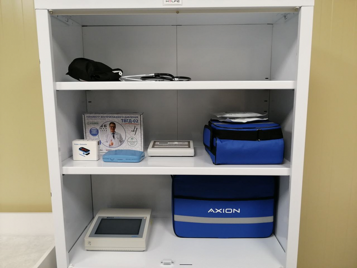 ФАП оснащен всем необходимым для оказания плановой помощи жителям и проведения профилактических осмотров. В комплектацию входит гинекологическое кресло, ингалятор для проведения кислородной и аэрозольной терапии, прибор для измерения АД, фонендоскоп, костыли, термометры, стетоскоп, экспресс-измерители глюкозы и холестерина, гемоглобинометр, спирометр, весы и ростомер.